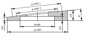 三偏心金屬硬密封蝶閥的密封面是斜錐面,閥體密封圈(圖1)與蝶板組合件密封圈(圖2)的接觸為面接觸,其工作原理是靠驅(qū)動裝置扭力直接帶動蝶板組合件,使蝶板組合件密封圈與閥體密封圈充分接觸后產(chǎn)生彈性變形而密封。三偏心金屬硬密封蝶閥作為一種高性能閥門,具有耐腐蝕性好、密封可靠、開啟力矩小等優(yōu)點。三偏心硬密封電動蝶閥DN1200,其中閥體密封圈材料為1Cr18Ni9Ti,蝶板組合件密封圈材料為復合的不銹鋼板與石棉板夾層組合件,閥體密封圈與蝶板組合件密封圈的加工質(zhì)量直接決定蝶閥密封性能。