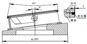 蝶板組合件起密封作用的零件是密封圈,密封圈為斜錐結構,其錐頂角為16°,厚度為13.5mm,由5層石棉板及4層不銹鋼板復合而成(圖6)。密封圈必須與蝶板和壓環(huán)等組裝在一起,加工時才能防止密封圈夾層中的不銹鋼板及石棉板翹曲變形。根據(jù)其結構特點,對蝶板組合件密封圈采用以下加工方法:(1)先在2.5m立車上分別把蝶板和壓環(huán)上的各止口加工到圖紙要求尺寸,外圓不加工;(2)按圖紙要求對壓環(huán)鉆孔,蝶板鉆孔攻絲;(3)壓環(huán)、密封圈和蝶板按圖紙裝配,將蝶板組合件工裝用螺栓緊固在閥體工裝上,然后再將蝶板組合件裝夾其上。立車刀桿旋轉8°車壓環(huán)、密封圈和蝶板至磨削尺寸;⑷用同樣厚度鋼板替下密封圈,車壓環(huán)、蝶板各錐面至圖紙尺寸;(5)工裝不動,將壓環(huán)、密封圈、蝶板重新按要求組裝,然后在立車刀架上裝磨頭,對密封圈進行磨削處理,使其達到圖紙設計粗糙度要求。